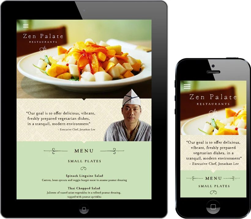 Zen Palate is a Pan-Asian vegetarian restaurant with several locations throughout the New York City area. The typography has a hand-drawn feel, emphasizing the restaurant's farm-to-table concept. Rich, appetizing colors and beautiful photography round out this design based on the restaurant's motto: The Art of Eating Well.